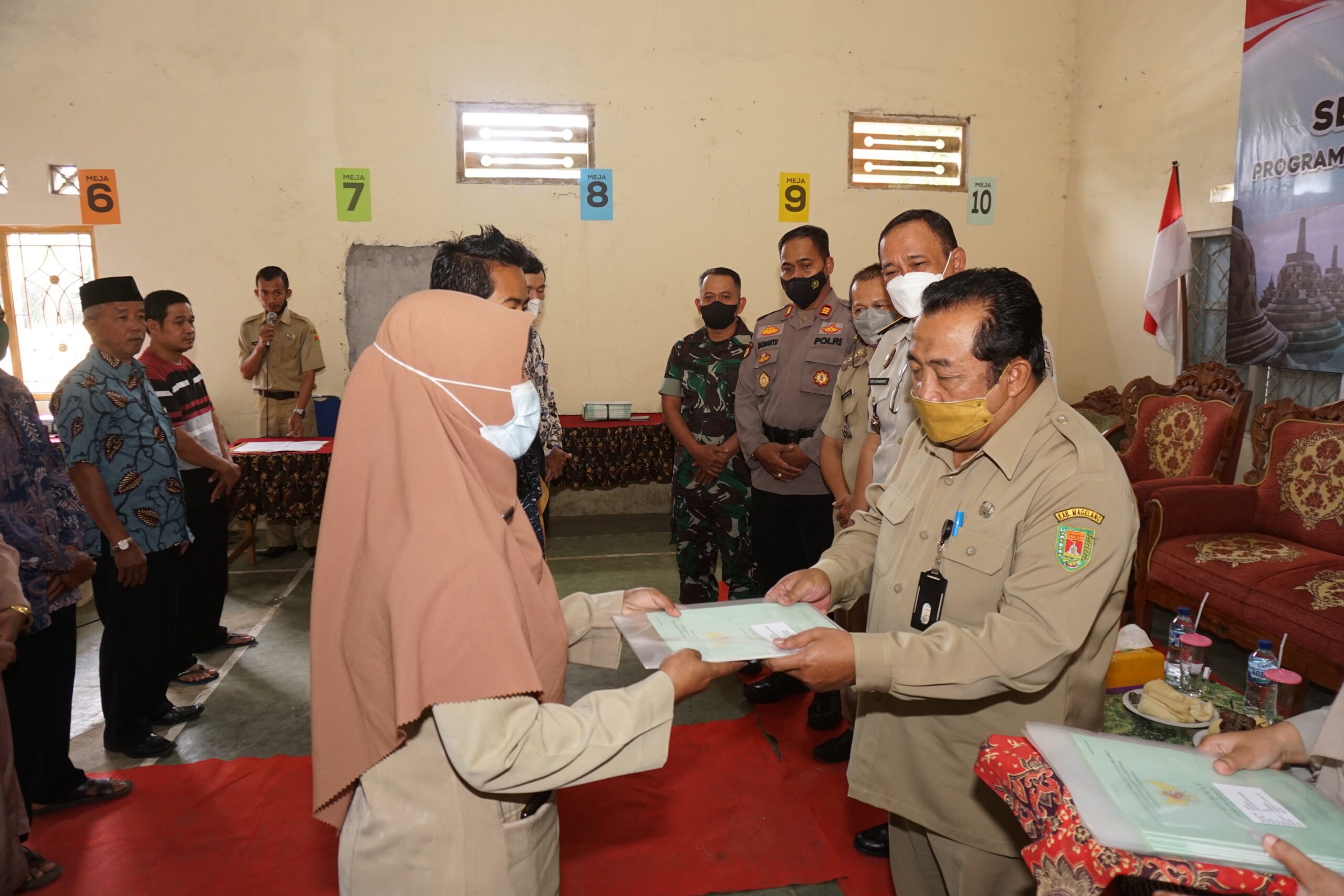 MAGELANG (wartamagelang.com) – Sebanyak 1.000 sertifikat program Pendaftaran Tanah Sistematis Lengkap (PTSL) dibagikan kepada warga di Desa Wonogiri, Kecamatan Kajoran. Hal ini merupakan komitmen Pemerintah untuk terus mempercepat program pensertifikatan tanah di seluruh Indonesia