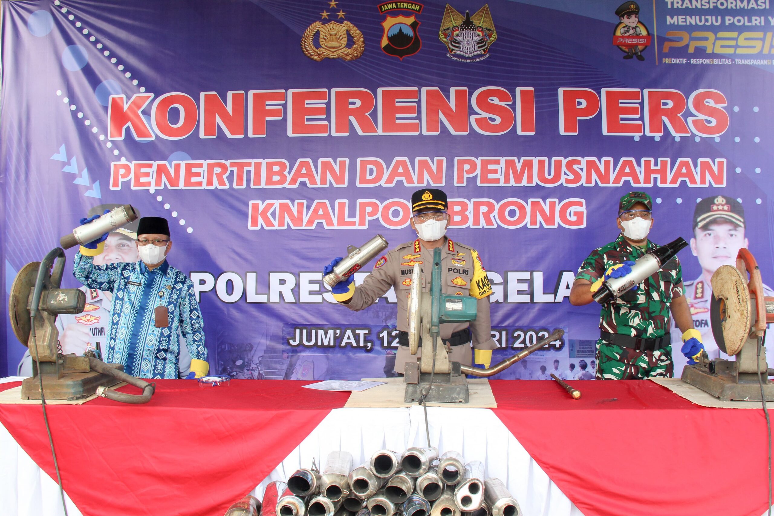 Pemusnahan Knalpot Brong hasil razia Satlantas Polresta Magelang, dilaksanakan di Depan Aula Mako Polresta Magelang, Jum’at (12/1/2024). Hadir Bupati Magelang diwakili Sekretaris Daerah Kabupaten Magelang, Adi Waryanto. Dalam acara pemusnahan knalpot brong tersebut dihadiri pula oleh Jajaran Forkompimda Kabupaten Magelang, perwakilan komunitas motor dan Perwakilan dari siswa-siswi SMA/SMK.