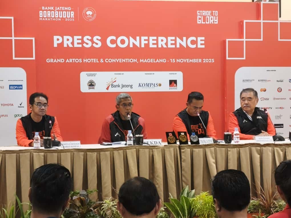 Pemimpin Redaksi Harian Kompas Haryo Damardono, dalam konferensi pers di ruang Aloevera Grand Artos Hotel Magelang, Sabtu (15/11/2025) menuturkan, selama sembilan tahun penyelenggaraan, Bank Jateng Borobudur Marathon (BJBM) selalu berhasil menjadi ruang bagi ribuan kisah tentang semangat, perjuangan, dan kebersamaan yang tumbuh di lintasan dan di hati masyarakat Jawa Tengah.