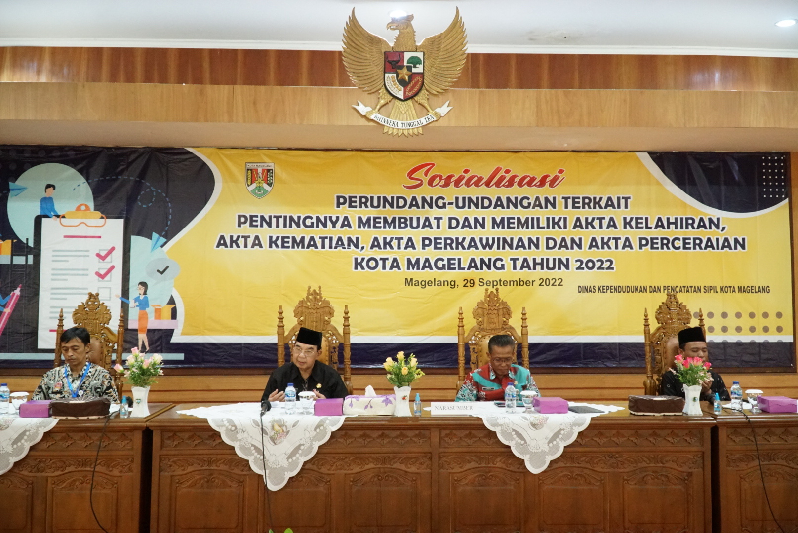 Hal itu dikatakan Wakil Wali Kota Magelang M. Mansyur dalam Sosialisasi Perundang-undangan Terkait Pentingnya Membuat dan Memiliki Akta Kelahiran, Akta Kematian, Akta Perkawinan dan Akta Perceraian di Kota Magelang di Aula Adipura Kencana, Kamis (29/9/2022). Dalam kesempatan tersebut, Mansyur menuturkan, Pemkot Magelang mendorong masyarakat untuk mengurus dan memiliki dokumen tersebut.