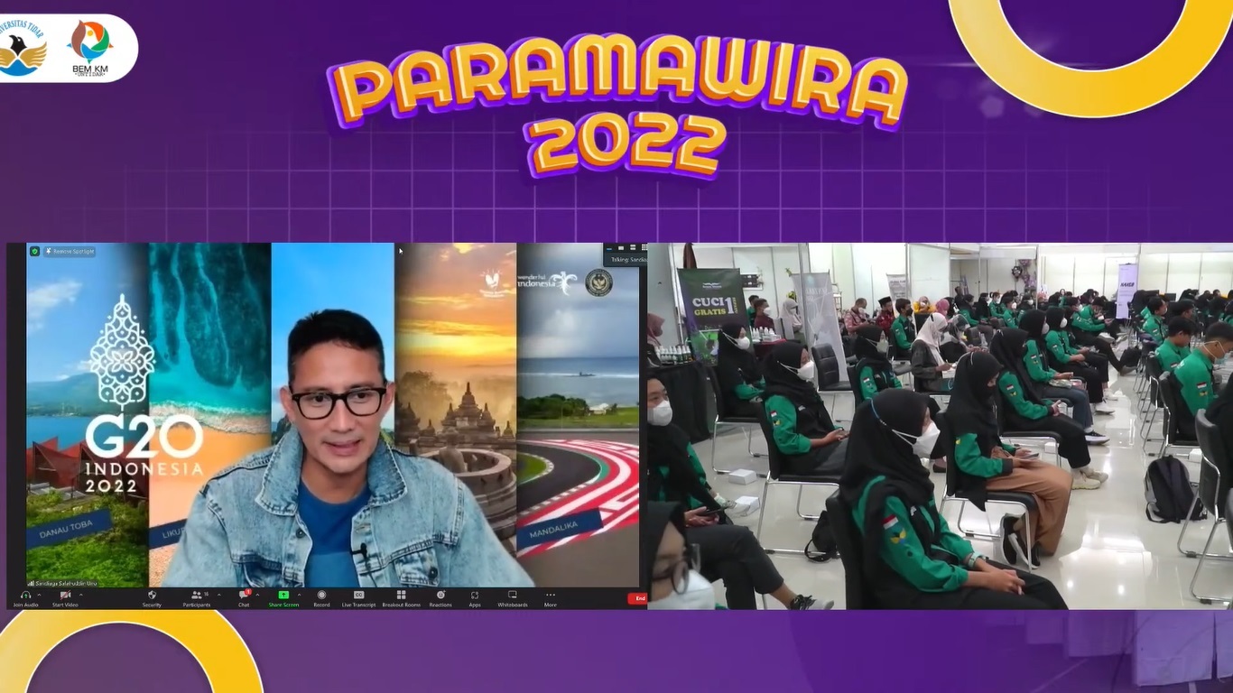 Hal ini disampaikannya pada pembukaan dan kuliah umum Pekan Raya Mahasiswa Wirausaha (Paramawira) 2022, Sabtu (23/07/2022) secara daring. Sandiaga menyampaikan kuliah umum secara Online sedangkan dua pembicara lain yaitu Heriwanto, Ketua Pemuda Tani HKTI Jawa Tengah dan Ajib Hamdani, Anggota Kamar dagang dan Industri (KADIN) menyampaikan secara offline langsung dari Gedung dr. H. R. Suparsono Untidar.