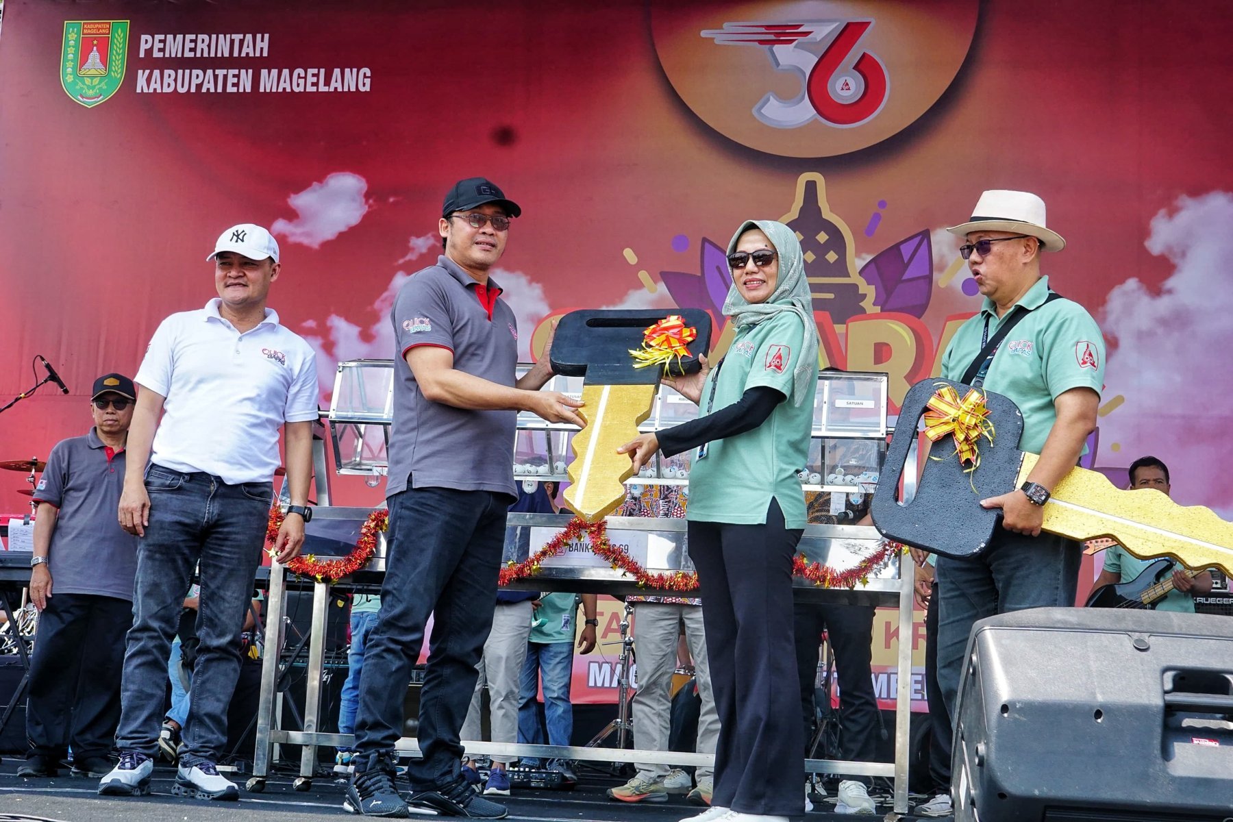 Bupati Magelang Grengseng Pamuji mengundi tabungan dan kredit umum serta kredit pegawai PT BPR Bank Bapas 69 Magelang (Perseroda) tahun 2025. Acara pengundian tersebut diawali dengan kegiatan jalan santai yang dimeriahkan dengan hiburan dangdut dari Latanza, di lapangan Randu Alas, Desa Tuksongo, Borobudur, Minggu (21/9/2025). Foto: Humas Prokompim Kabupaten Magelang