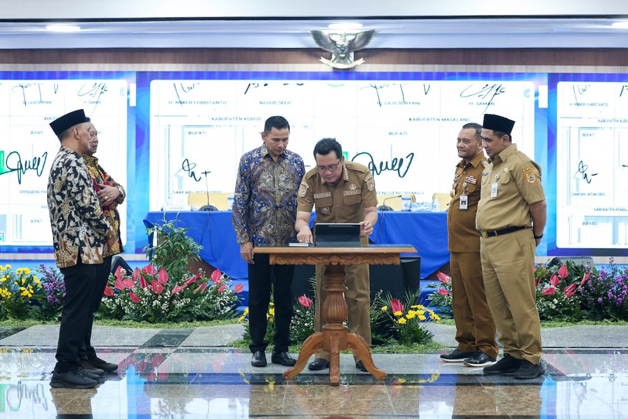 Semarang (wartamagelang.com) – Bupati Magelang Grengseng Pamuji, Wakil Bupati Magelang Sahid, Ketua DPRD Kabupaten Magelang Sakir, dan Sekretaris Daerah Kabupaten Magelang Adi Waryanto menghadiri Dialog Anti Korupsi dengan Komisi Pemberantasan Korupsi (KPK) RI di Gedung Gradhika Bhakti Praja, Kota Semarang, Senin (30/3/2025).