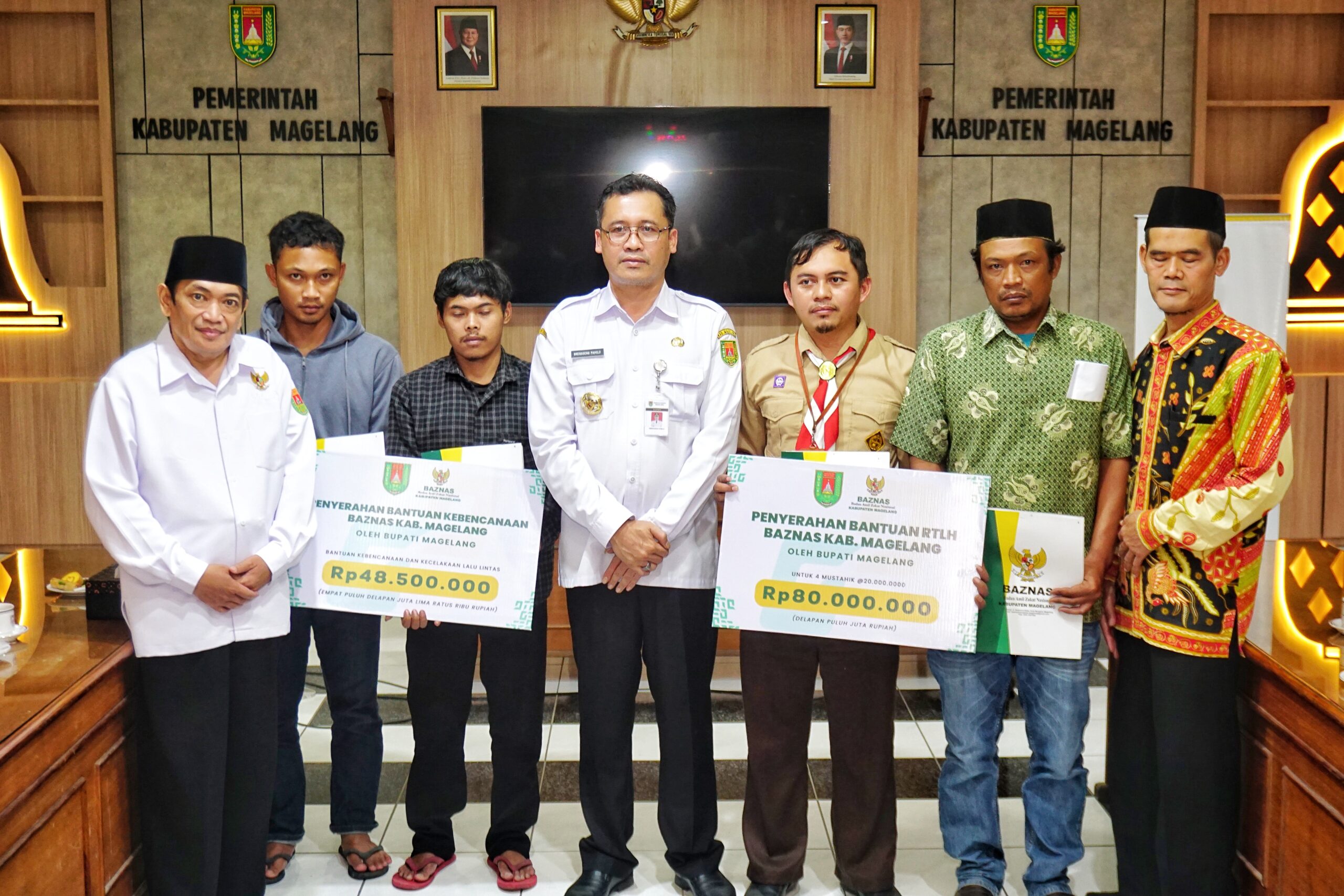 MAGELANG (wartamagelang.com) – Badan Amil Zakat Nasional (BAZNAS) Kabupaten Magelang menyerahkan pentasyarufan bantuan bencana alam dan Rumah Tidak Layak Huni (RTLH). Pentasyarufan bantuan ini diserahkan langsung oleh Bupati Magelang Grengseng Pamuji secara simbolis, bertempat di Ruang Cemerlang, Setda Kabupaten Magelang, Rabu (14/5/2025).
