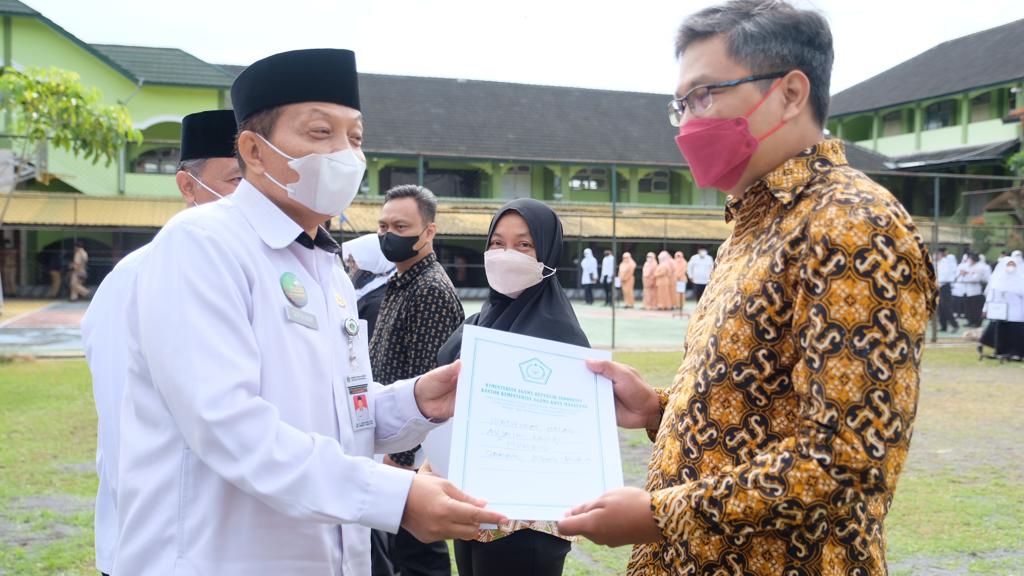 SERAHKAN SERTIFIKAT : Dalam upacara Hari Amal Bakti ke-76, diberikan pula sertifikat halan untuk UMKM, dan juga penghargaan Satya Lencana Karya Satya kepada ASN Kemenag (Dok Prokompim Kota Magelang)