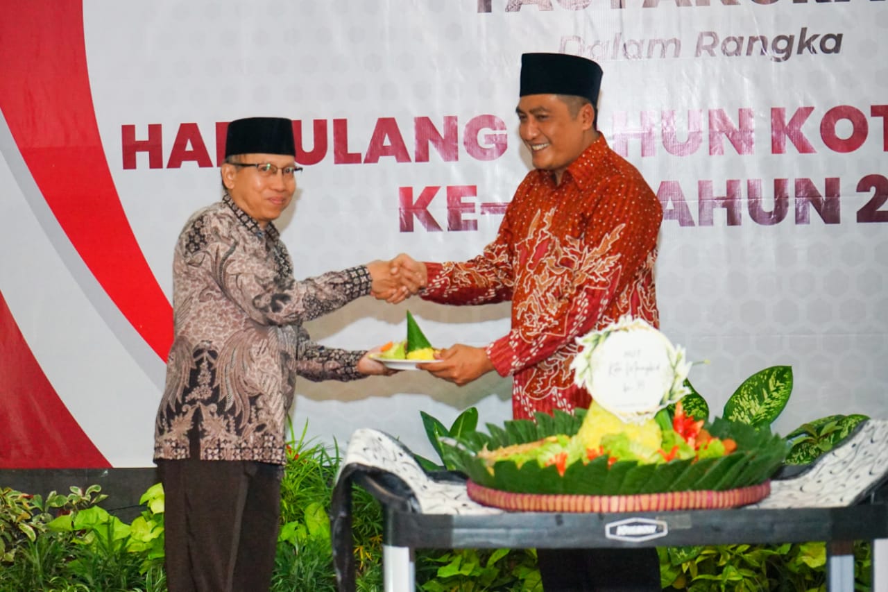 TASYAKURAN BERSAMA : Bupati Magelang Zaenal Arifin didampingi Sekretaris Daerah Kabupaten Magelang saat potong tumpeng pada malam tasyakuran Memperingati HUT Ke-39 Kota Mungkid (Dok Prokompim Kab Magelang)