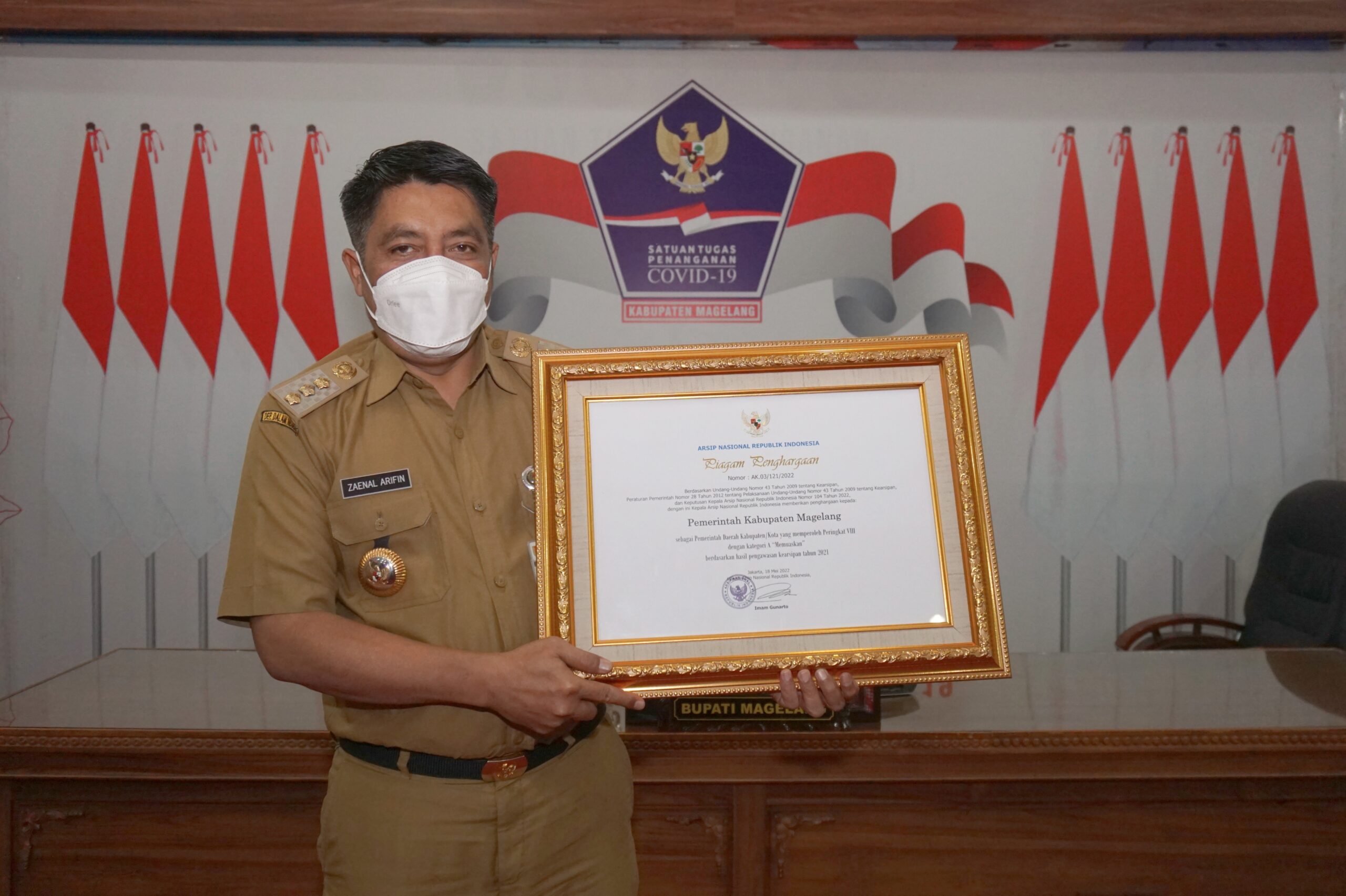 RAIH PENGHARGAAN : Bupati Magelang Zaenal Arifin menunjukkan piagam penghargaan di bidang kearsipan dengan Kategori A 'Memuaskan' (Dok Prokompim Kab Magelang)