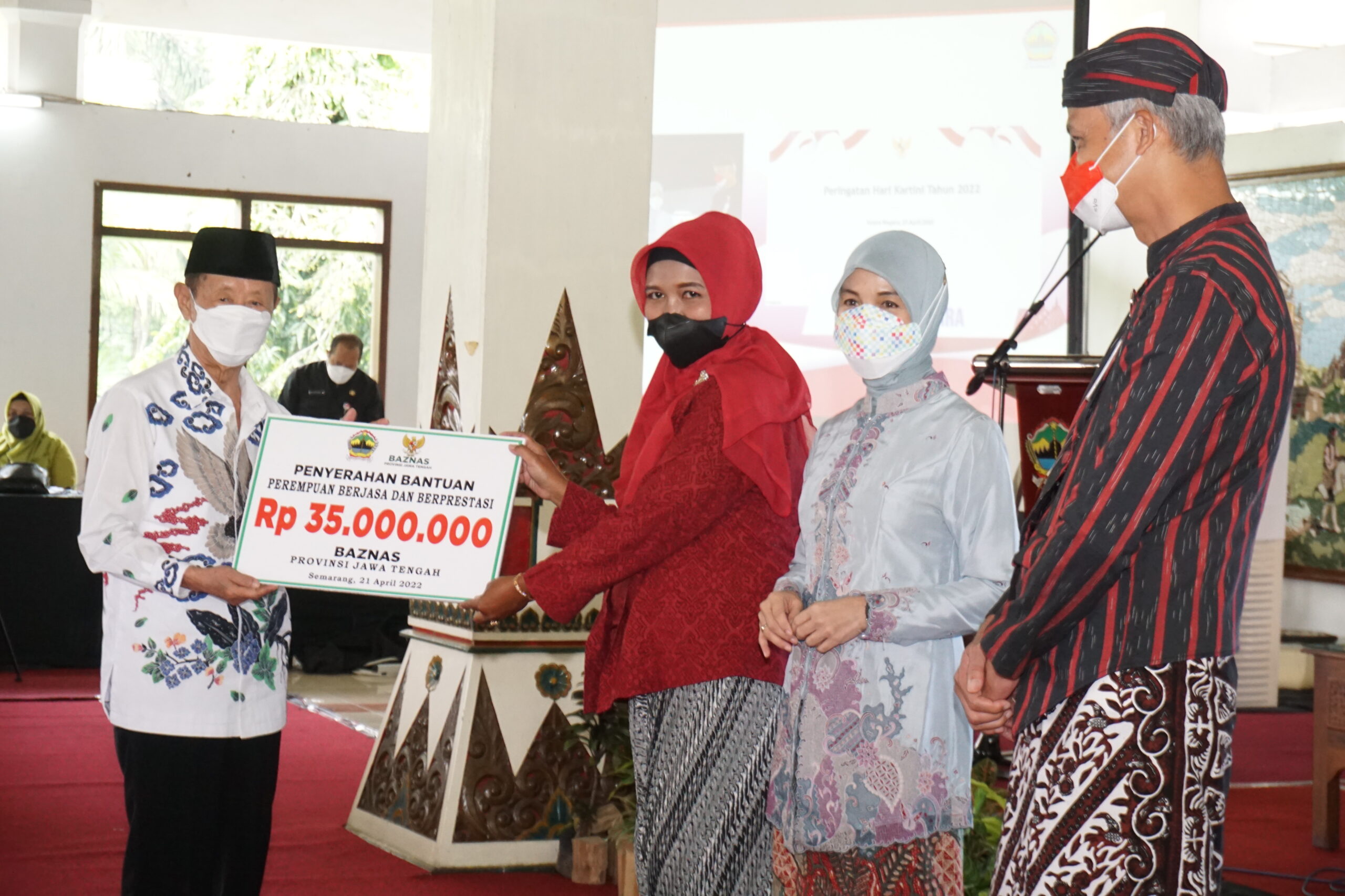 RAIH PENGHARGAAN : Ketua Kelompok Usaha Bersama (KUB) Sari Rejeki, Desa Banjarsari, Kecamatan Windusari, Nurlaela saat menerima penghargaan (Dok Prokompim Kab Magelang)