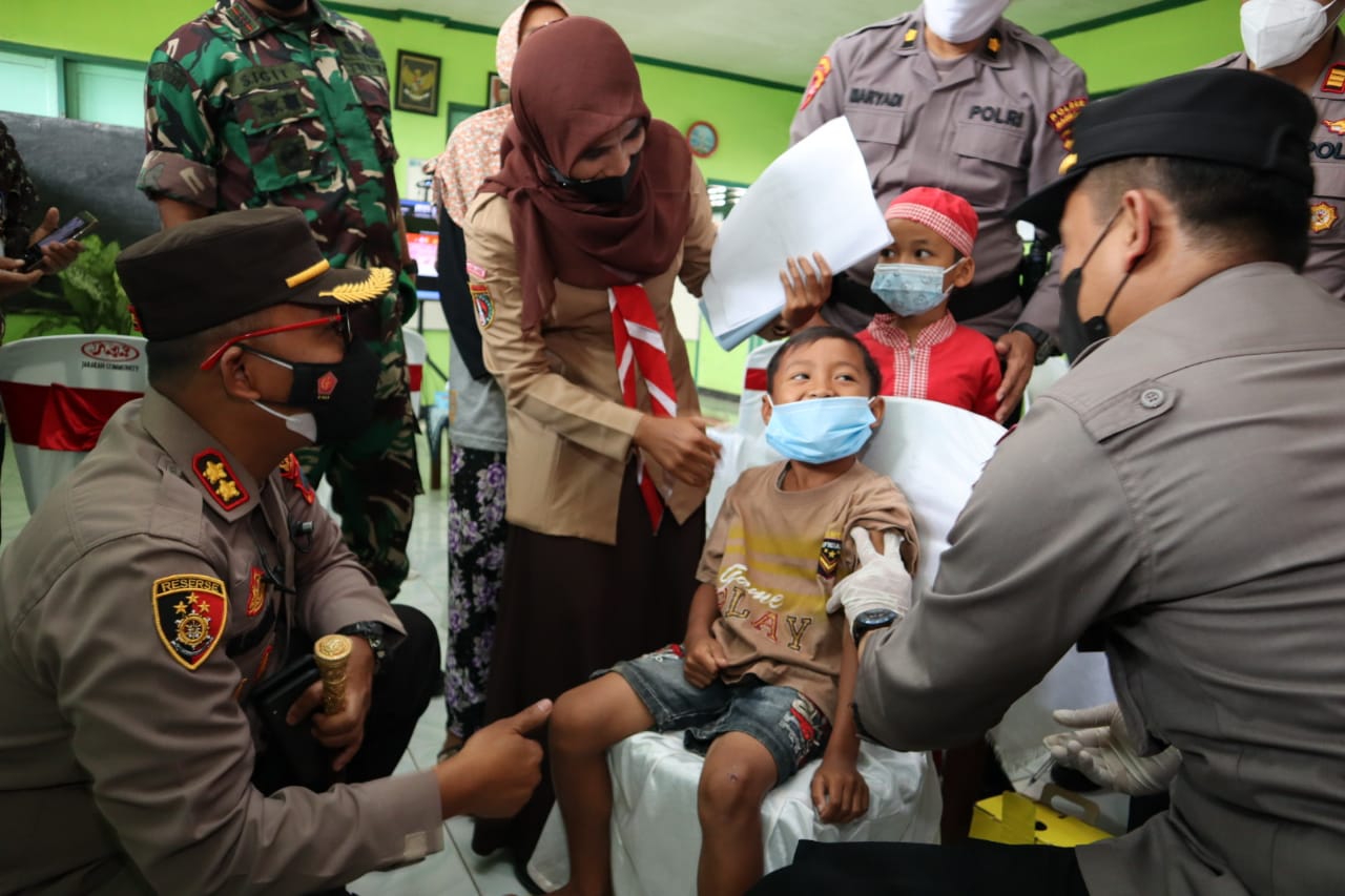 HIBUR ANAK : Kapolres Magelang AKBP Mochammad Sajarod Zakun terlihat menghibur anak-anak yang sedang mengikuti vaksinasi (Dok Humas Polres Magelang)