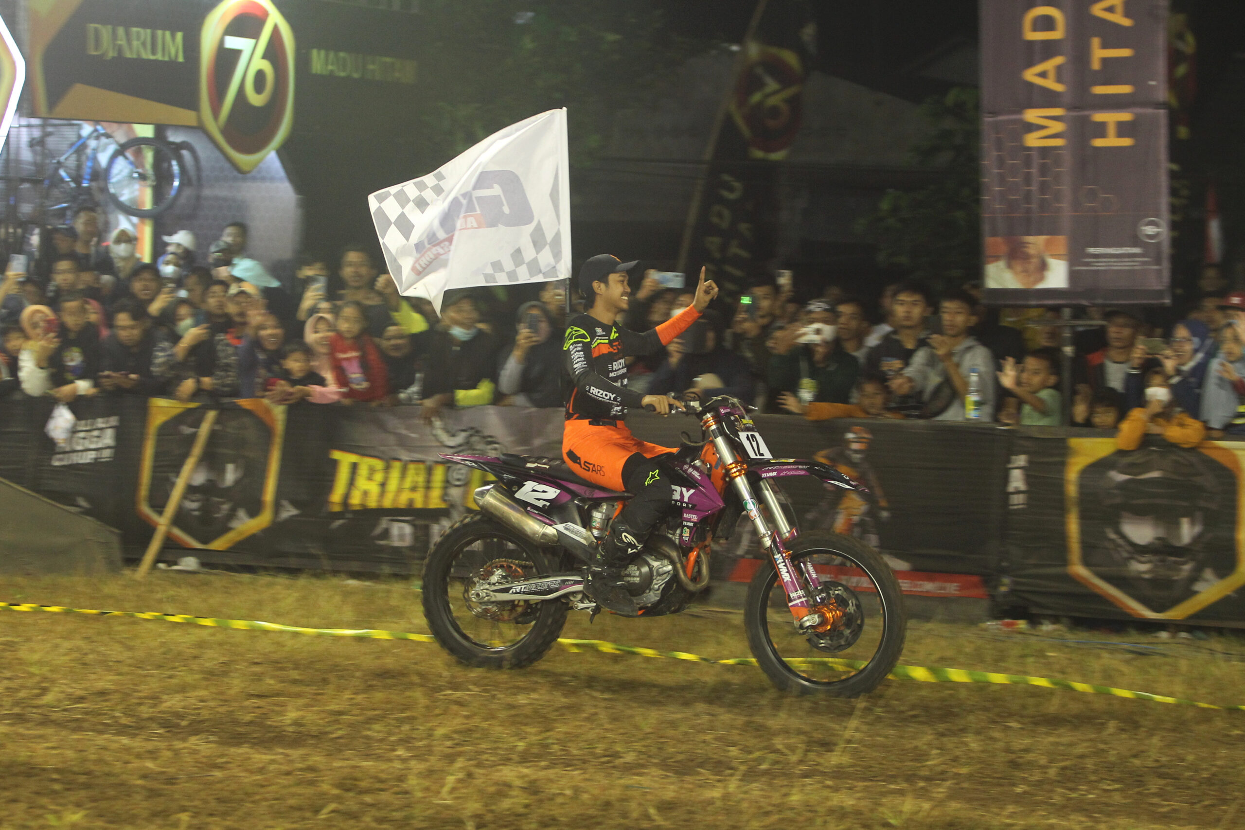RAYAKAN KEMENANGAN : Pebalap dari Tim Rizqy Motorsport, Lantian Juan, merayakan kemenangan usai merebut Juara Umum Trial Game Dirt di Magelang (Dok Trial Game Dirt)