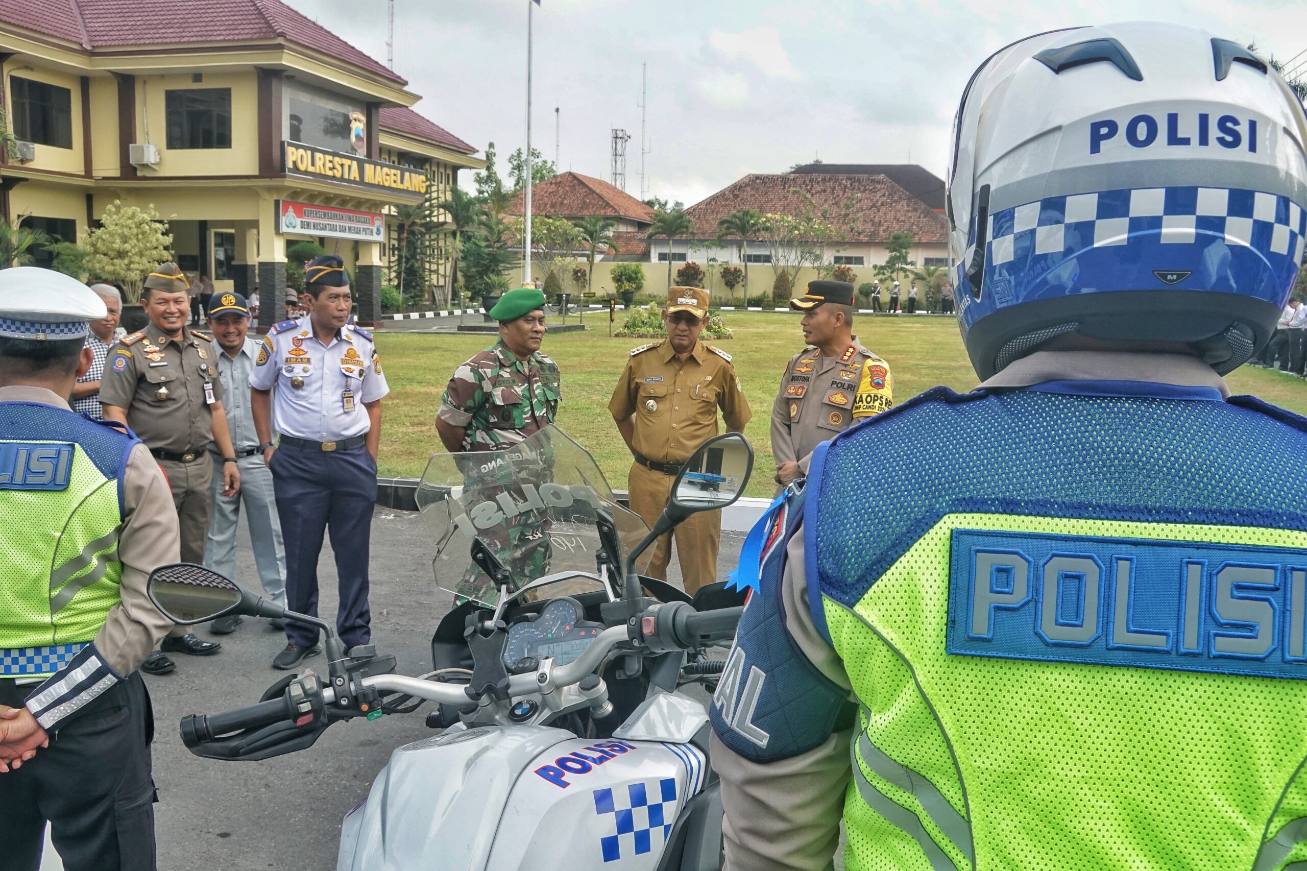 CEK PASUKAN : Pj Bupati Magelang didampingi Kapolresta Magelang Kombes Pol Mustofa saat melakukan pemeriksaan sarana dan prasarana pada kegiatan Operasi Zebra Candi 2024 (Dok Prokompim Kab Magelang)