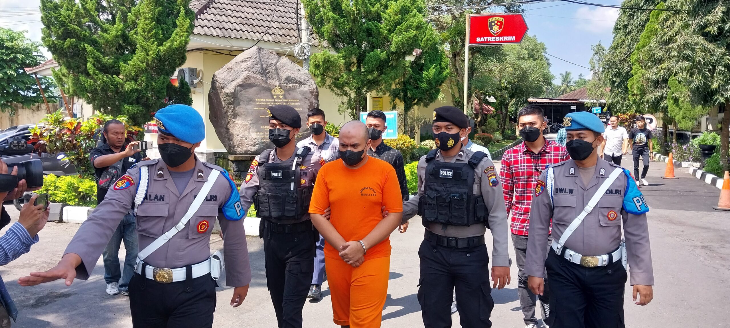 DIKAWAL KETAT : Tersangka pembunuh keluarganya sendiri, Dhio Daffa Syadilla, 22, dikawal kepolisian saat dihadirkan dalam rilis pers (Hadianto/wartamagelang.com)