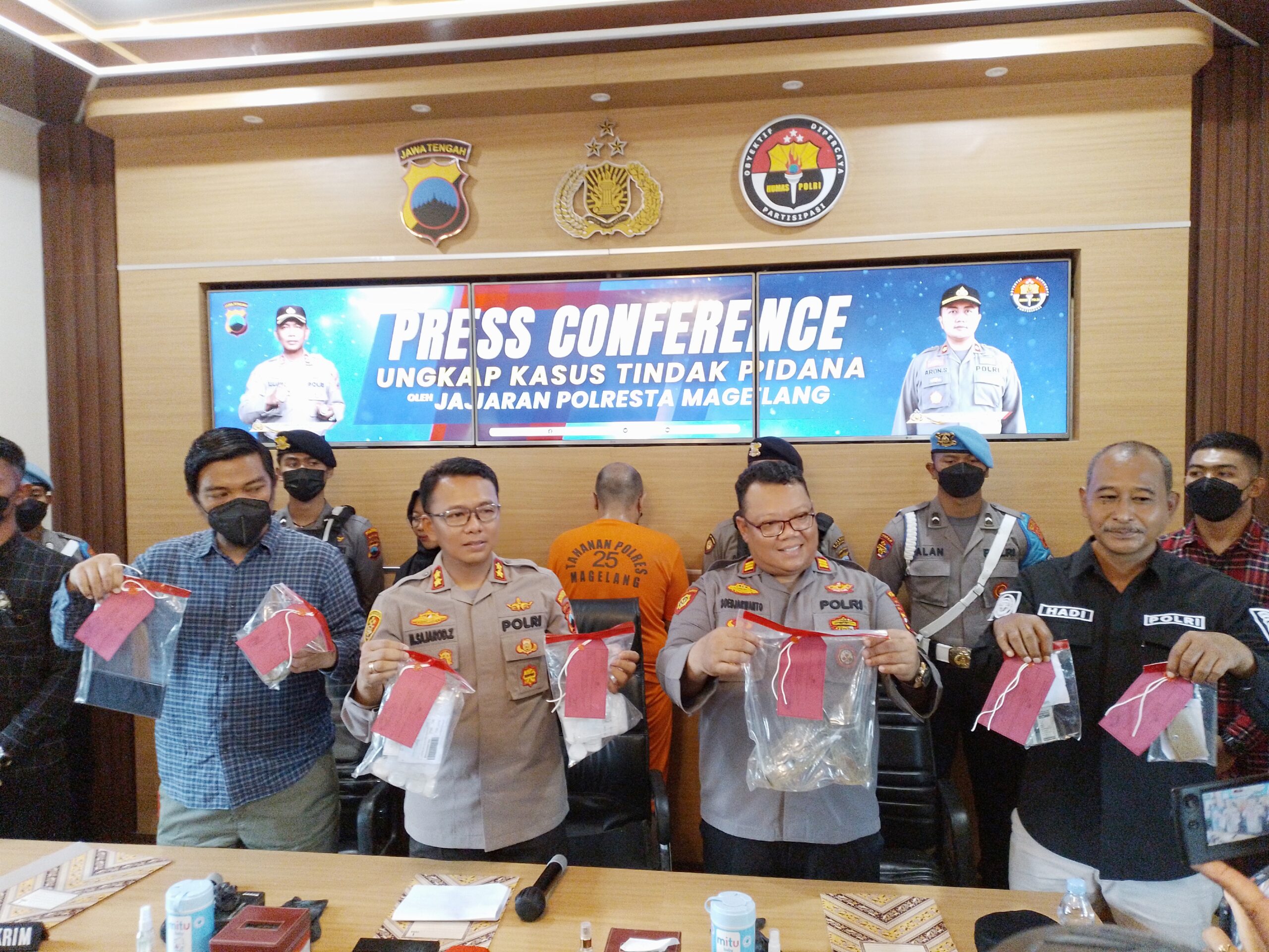 TUNJUKKAN BB : Plt Kapolresta Magelang AKBP Mochammad Sajarod Zakun menunjukkan barang bukti kejahatan Dhio (Hadianto/wartamagelang.com)
