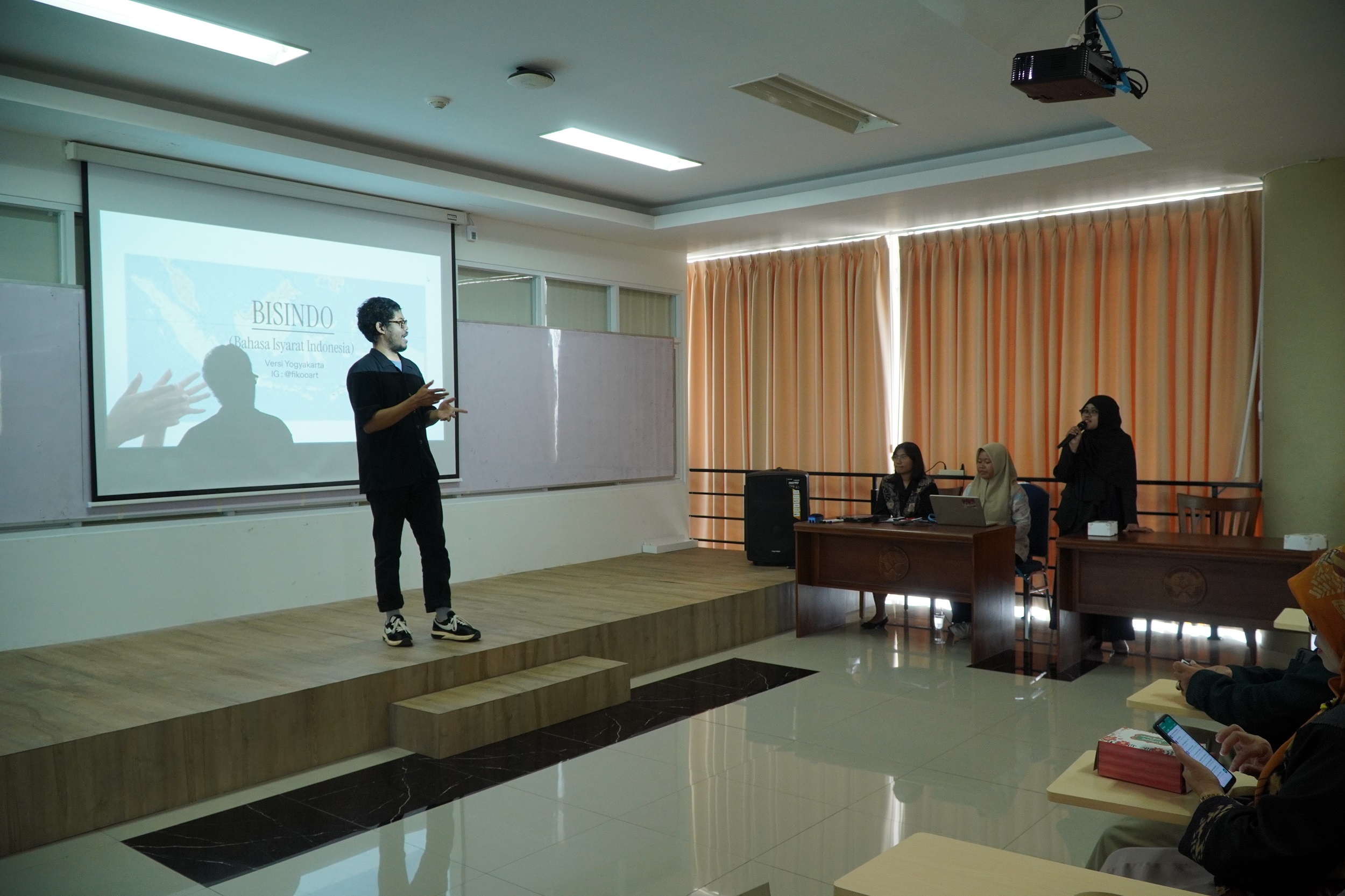 PAPARKAN MATERI : Salah satu narasumber menyampaikan materi kegiatan pelatihan bahasa isyarat bagi mahasiswa relawan (Dok Humas UNTIDAR)