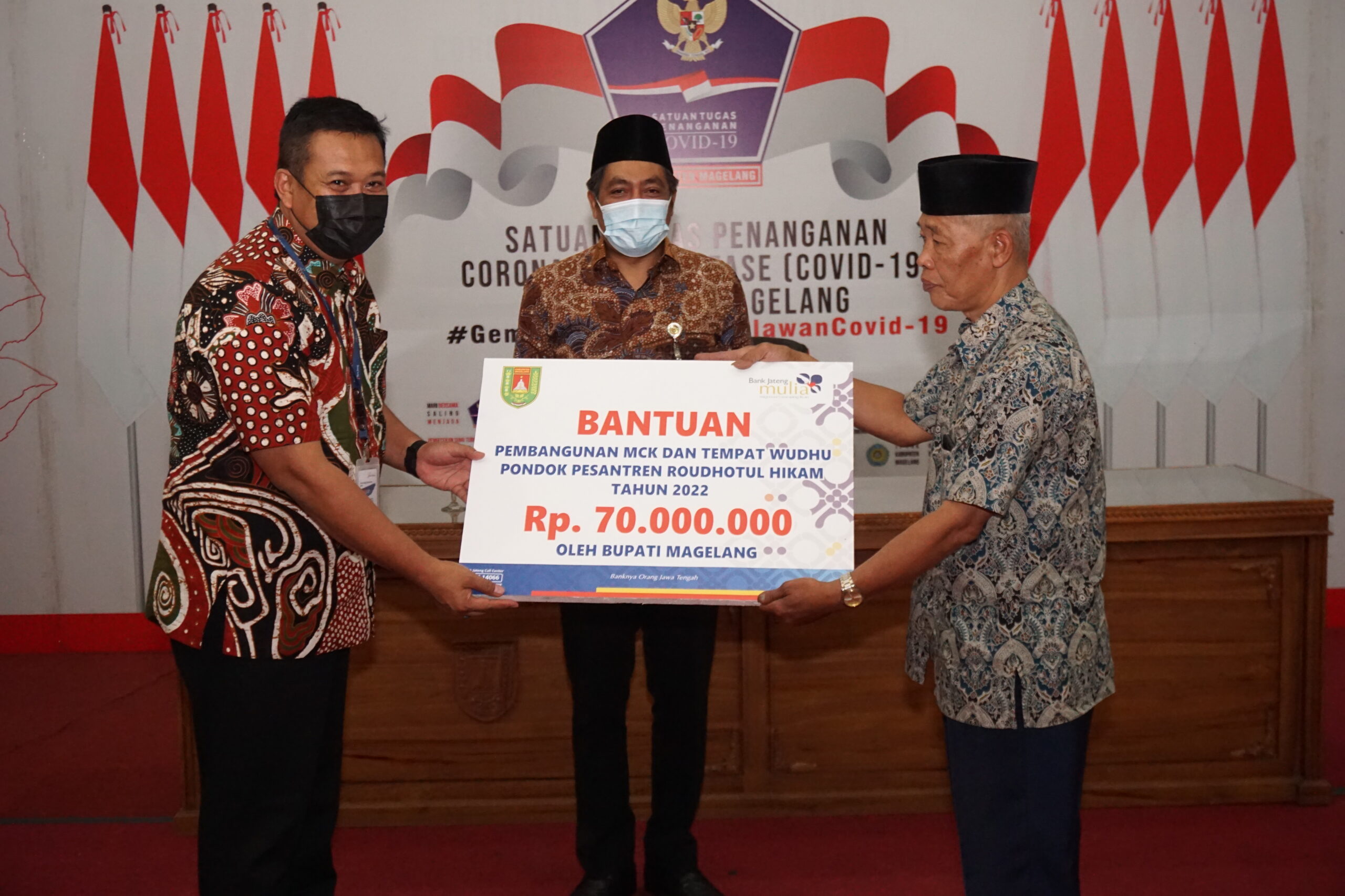 MAGELANG (wartamagelang.com) Pemerintah Kabupaten (Pemkab) Magelang menyerahkan bantuan dana hibah Tahun Anggaran 2022 sebesar Rp 100 juta. Pemberian hibah ini ditujukan kepada Pondok Pesantren Roudhotul Hikmah dan Kelompok Kader Pembangunan Desa Pucang, Kecamatan Secang untuk pemugaran rumah kurang mampu.