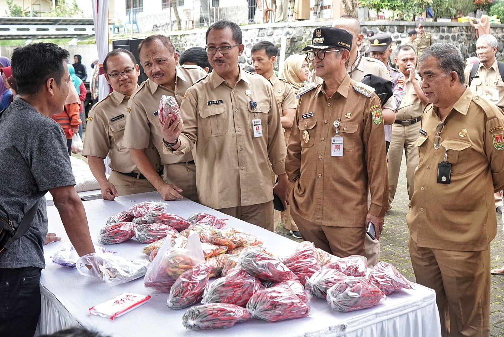 TINJAU LANGSUNG : Pj Bupati Magelang Sepyo Achanto didampingi Kepala Distan Pangan dan Kepala Disdakop UKM saat meninjau langsung kegiatan Gerakan Pangan Murah di halaman Kantor Kecamatan Ngablak (Dok Prokompim Kab Magelang)