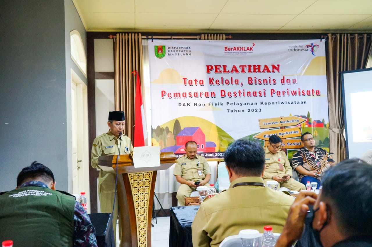 Hal ini disampaikan Bupati Magelang diwakili Sekretaris Daerah Kabupaten Magelang, Adi Waryanto saat kegiatan pelatihan tata kelola bisnis dan pemasaran di destinasi pariwisata bertempat di Aula Sevilla Resort, Selasa (6/6/2023). Hadir Plt Kepala Dinas Pariwisata Kepemudaan dan Olahraga (Disparpora) Kabupaten Magelang, Slamet Achmad Husein.