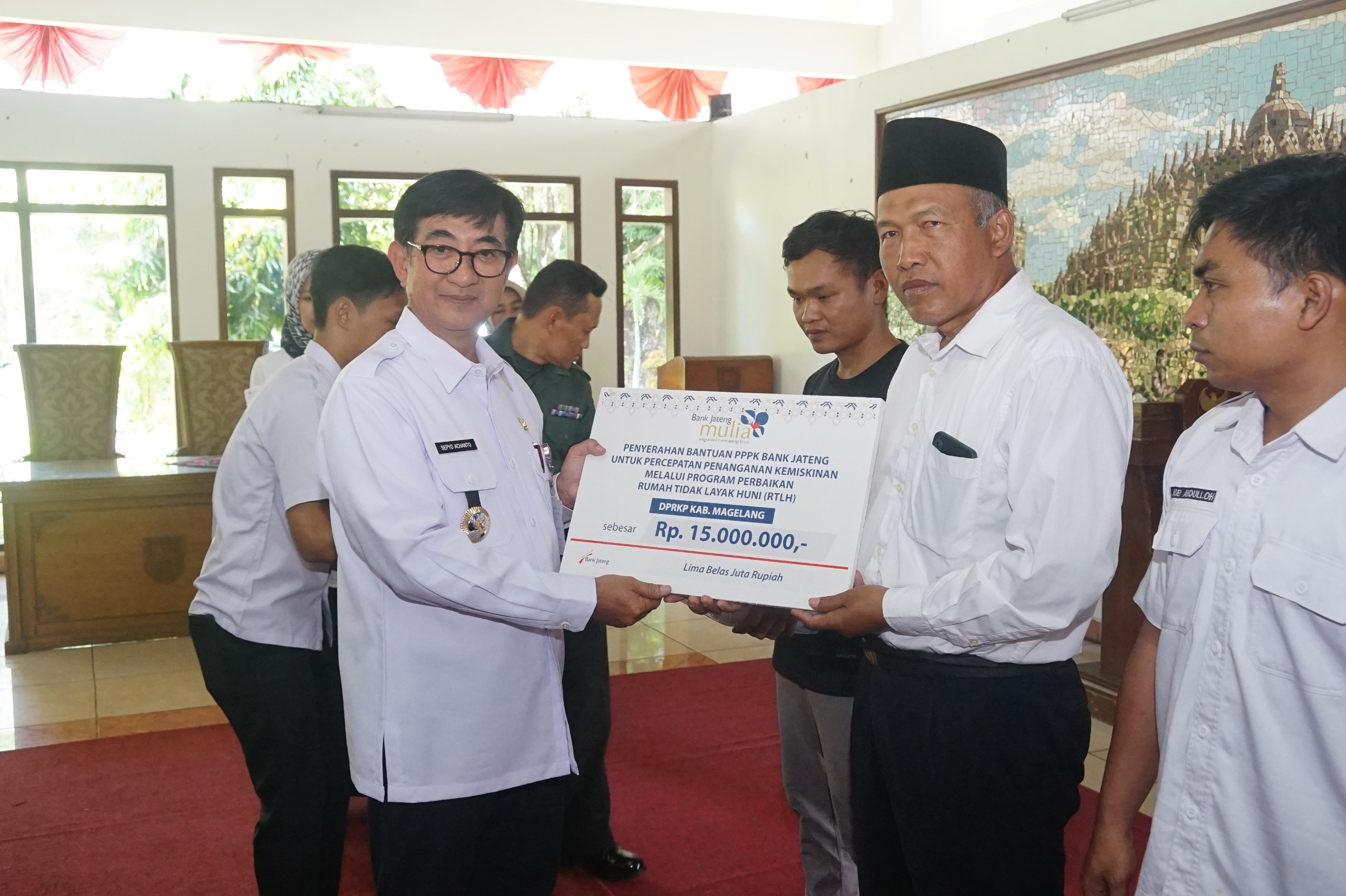 MAGELANG (wartamagelang.com) – Pemerintah Kabupaten Magelang menyerahkan bantuan sosial kepada 24 penerima perbaikan Rumah Tidak Layak Huni (RTLH) di Pendopo Komplek Setda Kabupaten Magelang, Rabu (28/8/2024). Bantuan tersebut diserahkan secara simbolis oleh Pj Bupati Magelang Sepyo Achanto, dan pada momen peringatan Hari Perumahan Nasional ke 16 (Hapernas) 2024 Tingkat kabupaten Magelang.