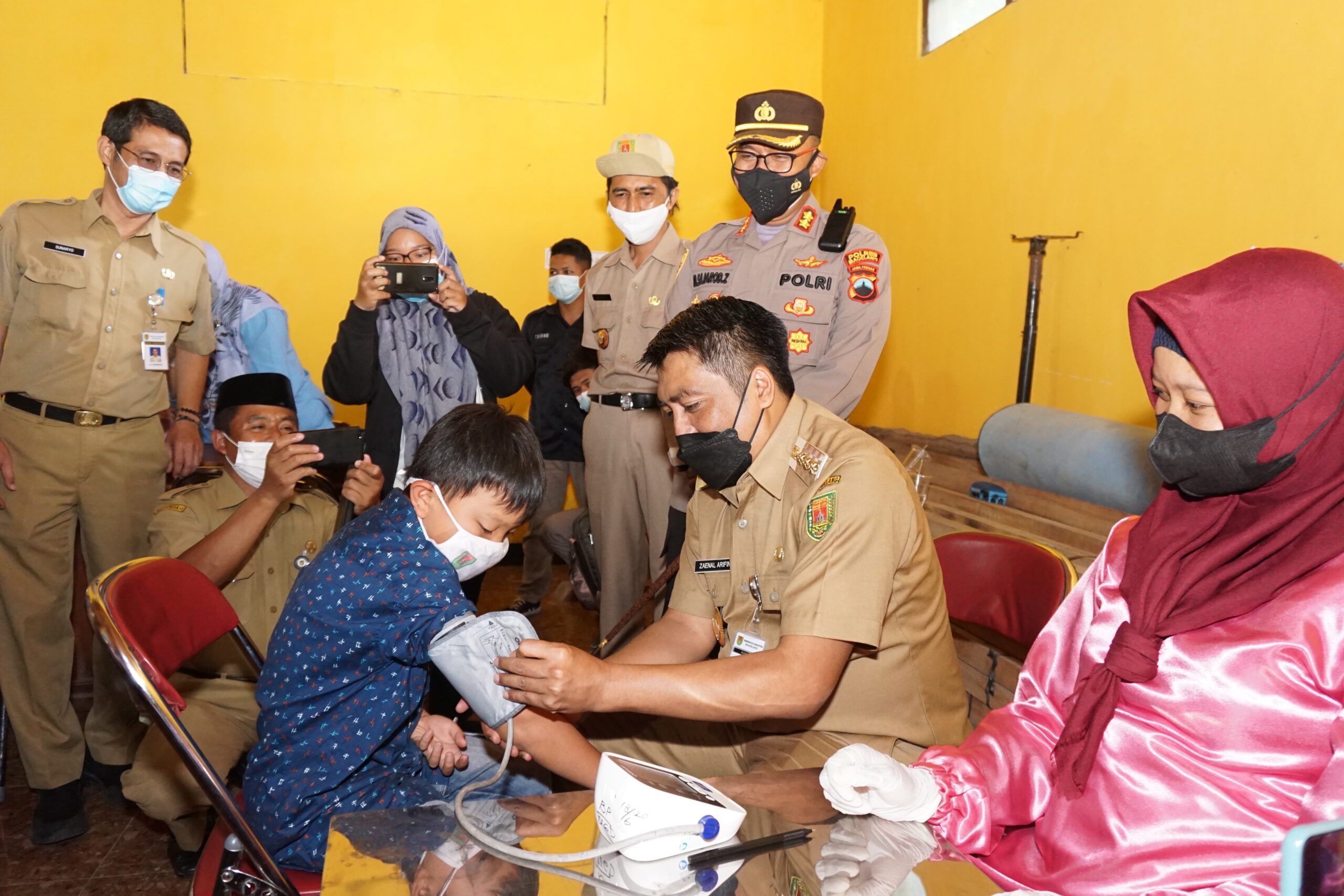PANTAU VAKSINASI : Bupati Magelang Zaenal Arifin bersama Kapolres Magelang AKBP Sajarod Zakun memantau pelaksanaan vaksinasi anak usia 6-11 tahun di Desa Banyusidi (Dok Prokompim Kab Magelang)