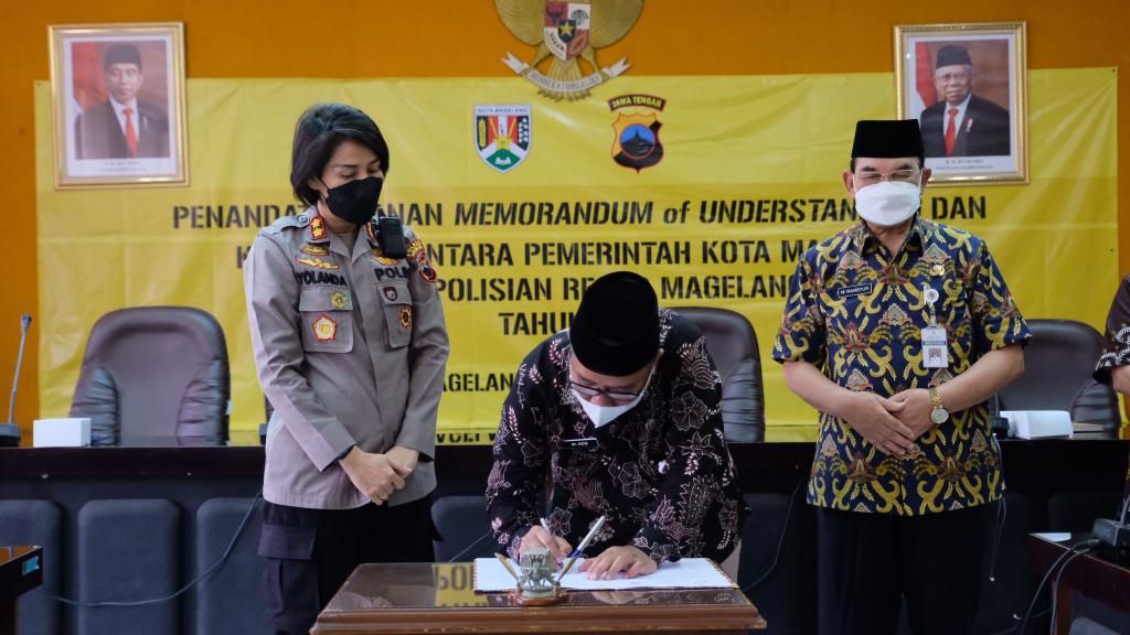 TEKEN KERJASAMA : Wali Kota Magelang dr. Muchamad Nur Aziz bersama Kapolres Magelang AKBP Yolanda Evalyn Sebayang meneken kerjasama (Dok Prokompim Kota Magelang)