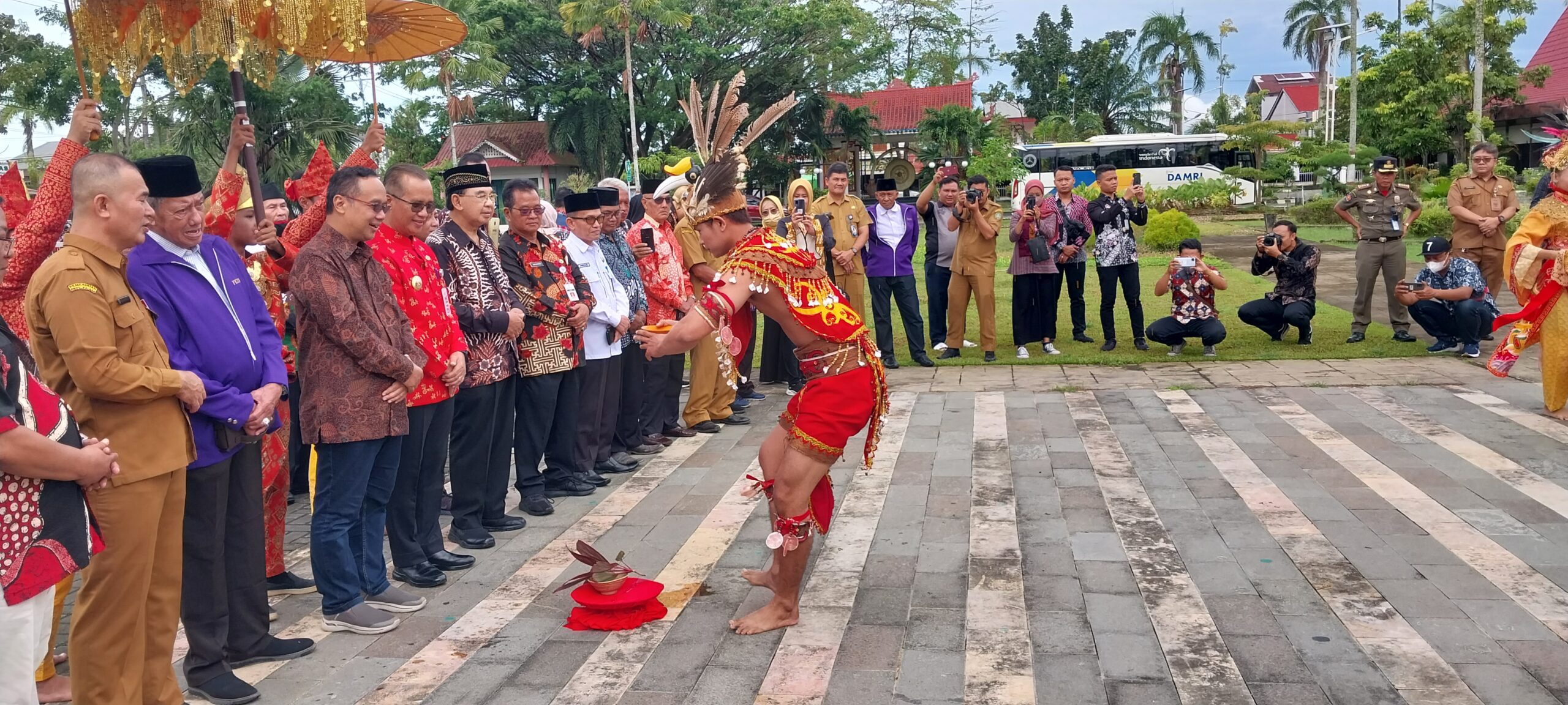 DISAMBUT TARIAN : Rombongan Pemkot Magelang yang dipimpin Wali Kota Magelang dr Muchammad Nur Aziz diterima langsung oleh Pj Wali Kota Singkawang H Sumastro disertai tarian khas penyambutan (Hadianto/wartamagelang.com)