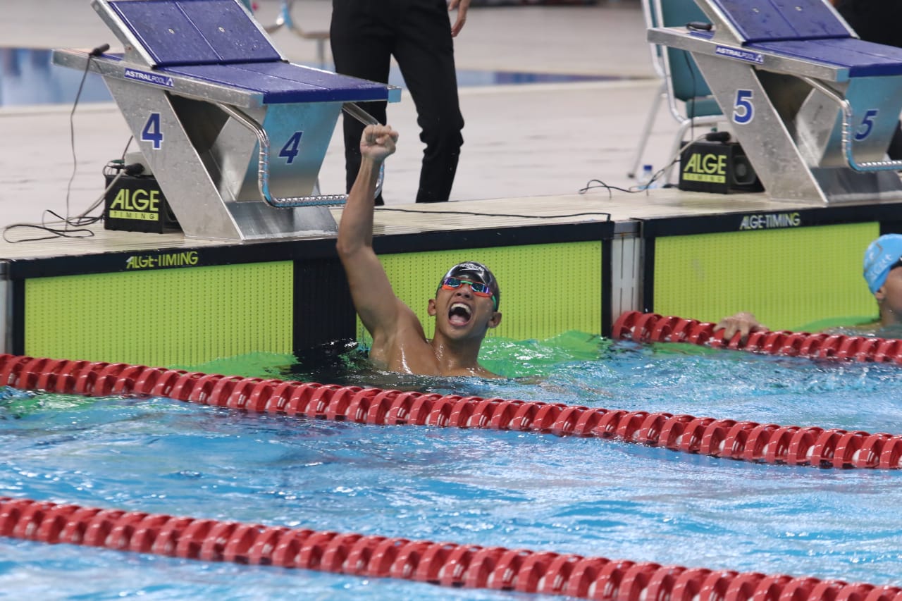 TAMPAK SENANG : Perenang DKI Jakarta Ibrahim Faqih tampak senang dan emosional usai berhasil meraih medali (Dok PB PRSI)
