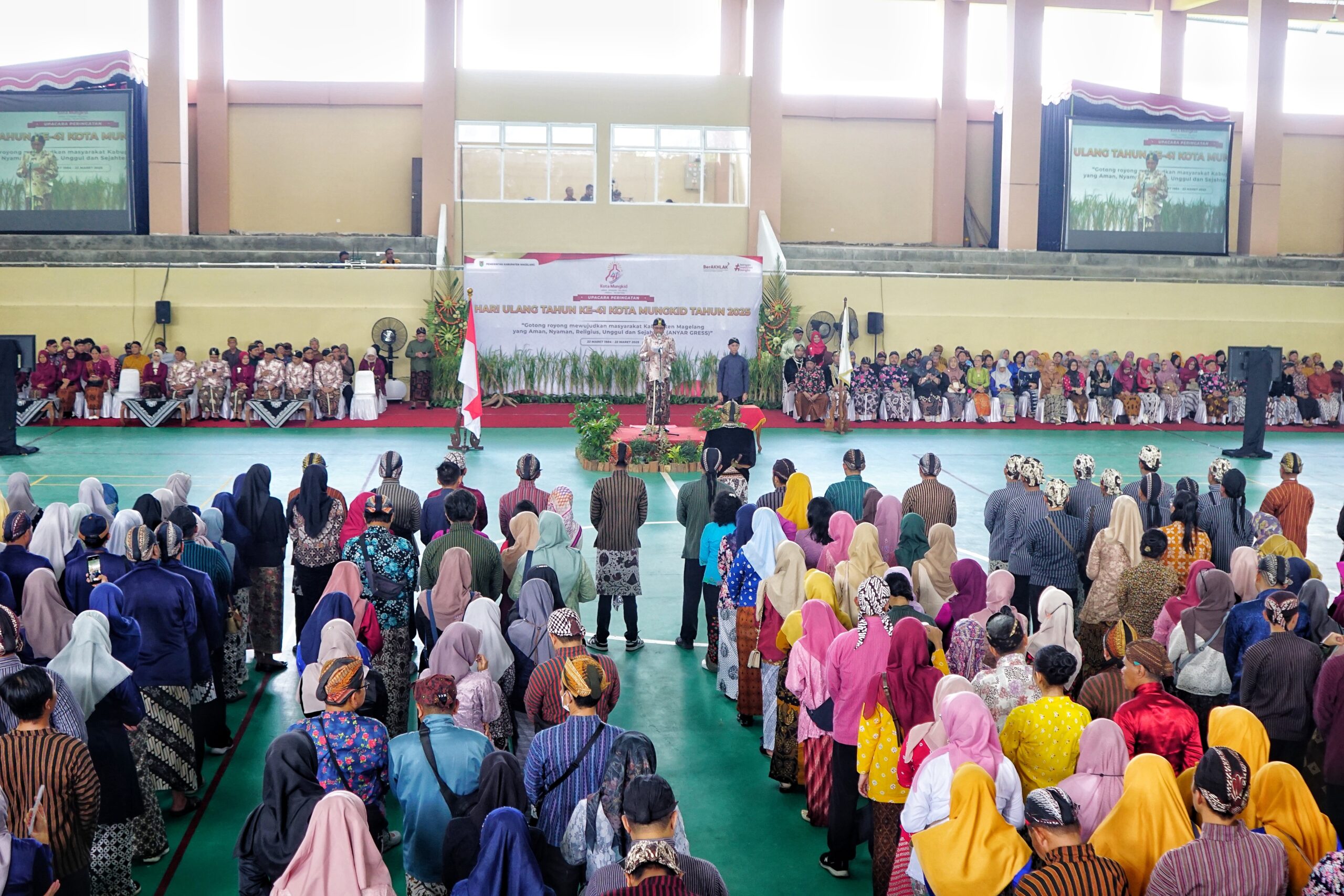 MAGELANG (wartamagelang.com) – Sebanyak 2.000 peserta upacara peringatan Hari Ulang Tahun (HUT) Ke-41 Kota Mungkid tahun 2025 mengenakan pakaian adat Jawa. Upacara tersebut dipimpin langsung oleh Bupati Magelang Grengseng Pamuji bertempat di GOR Pakubumi kompleks Gelora Nusantara, Bumirejo, Kabupaten Magelang, Sabtu (22/3/2025).