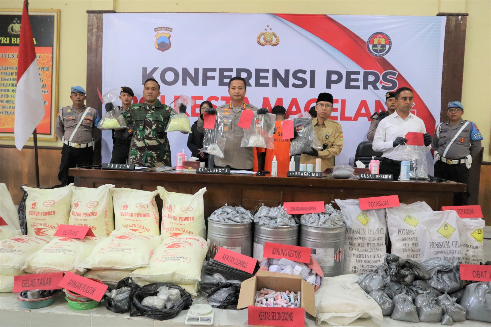 UNGKAP PEMBUAT PETASAN : Kapolresta Magelang Kombes Pol. Ruruh Wicaksono didampingi Dandim 0705/Magelang dan Sekda Kabupaten Magelang menunjukkan tersangka serta barang bukti petasan (Dok Humas Polresta Magelang)