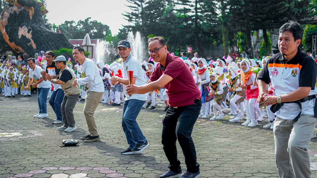 KOTA MAGELANG (wartamagelang.com) Ribuan pelajar tampil menarikan Tari Kuntulan di Taman Kyai Langgeng (TKL) Ecopark Kota Magelang, dalam acara Launching Pentas Seni, Minggu (16/7/2023). Istimewanya, mereka tampil di hadapan pencipta Tari Kuntulan, yaitu Alif Maryono (82).