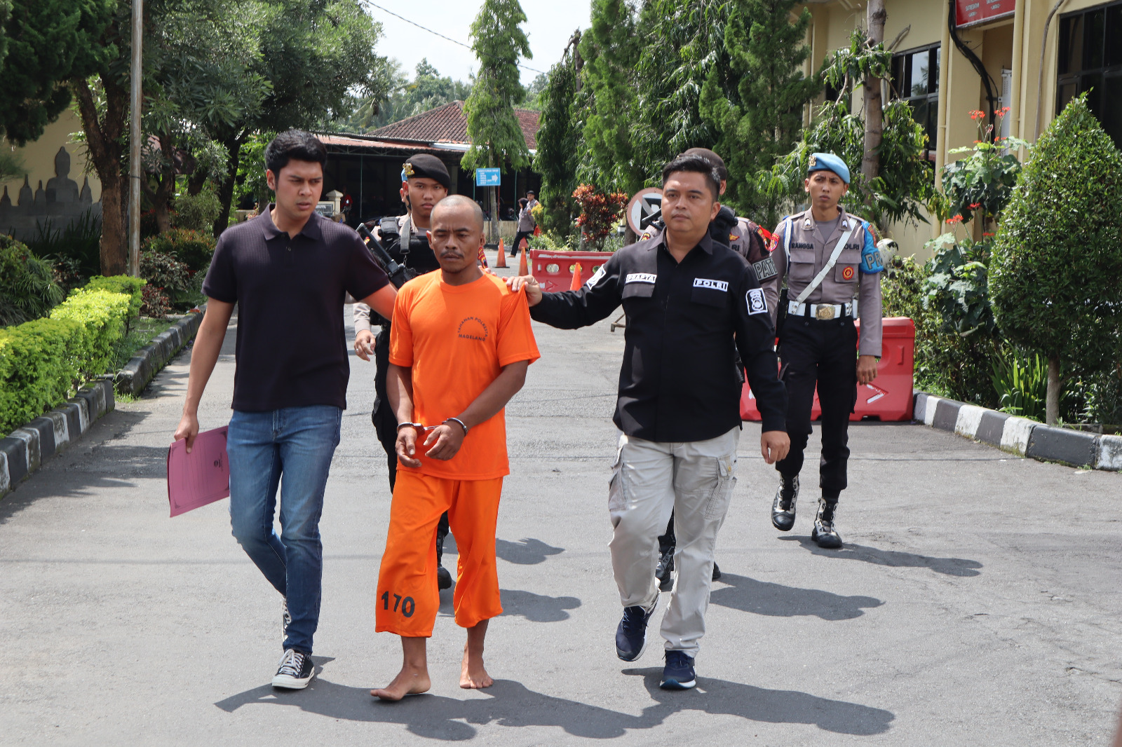 SUAMI TEGA : Tersangka sekaligus suami korban, S, 44, warga Dusun Karangnyar Desa Krasak Kecamatan Salaman digelandang usai diketahui membunuh istrinya sendiri (Dok Humas Polresta Magelang)