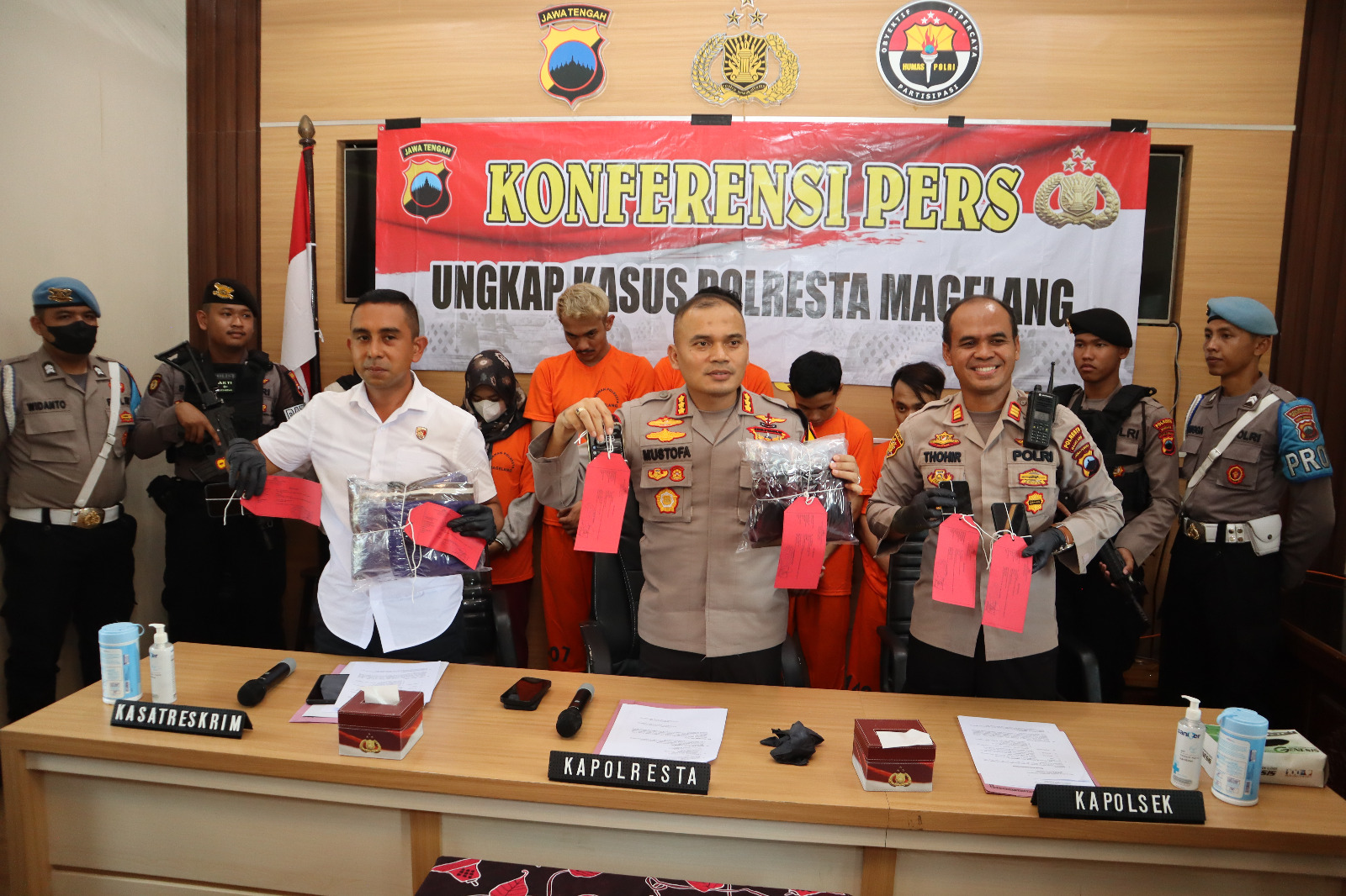 TUNJUKKAN BARANG BUKTI : Kapolresta Magelang Polda Jawa Tengah KBP Mustofa didampingi Kasat Reskrim Kompol Rifeld Constantien Baba, dan Kasihumas AKP Prapta Susila menunjukkan barang bukti kasus (Dok Humas Polresta Magelang)