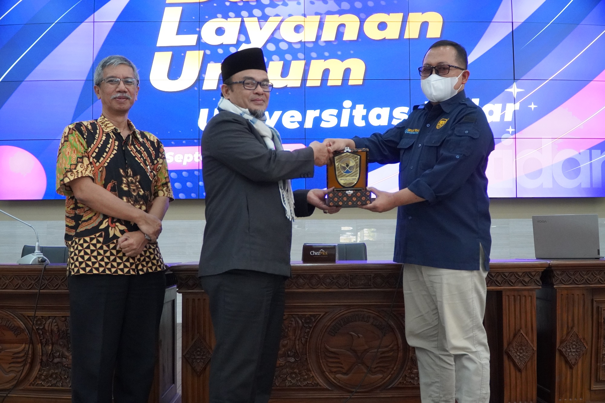 SOSIALISASIKAN BLU : Rektor Untidar Prof Sugiyarto menyerahkan kenang-kenangan kepada Tim Tranformasi Satker-BLU Universitas Sebelas Maret (UNS), Drs. Santoso Tri Hananto usai sosialisasi Badan Layanan Umum (Dok Humas Untidar)