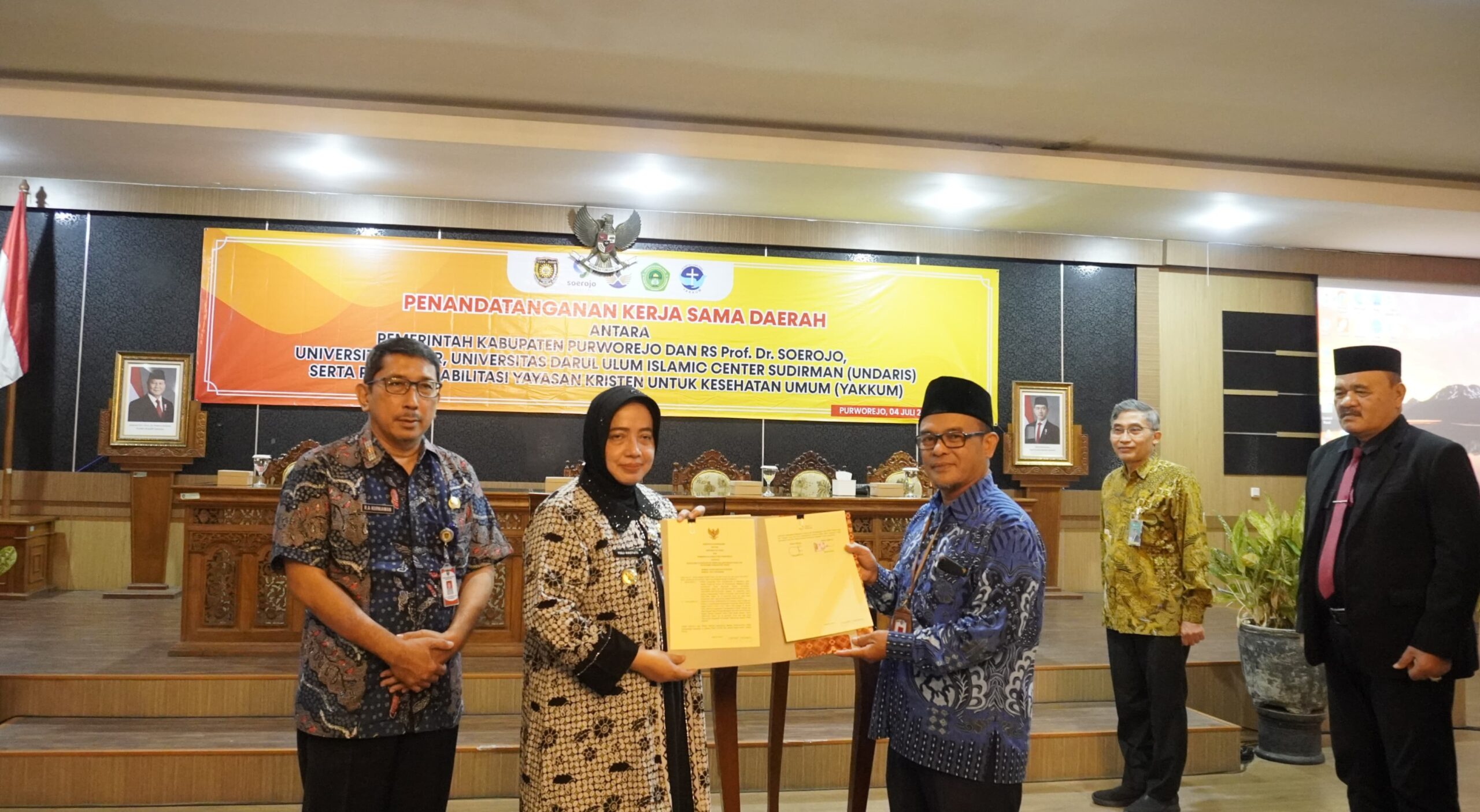 Dalam kesempatan yang sama, hadir pula Rektor Universitas Darul Ulum Islamic Centre Sudirman Semarang (UNDARIS), Direktur Pusat Rehabilitasi Yayasan Kristen Untuk Kesehatan Umum (YAKKUM), dan Direktor Soerojo Hospital yang pada kesempatan juga melakukan penandatangan kerjasama dengan Pemkab Purworejo (had/aha)