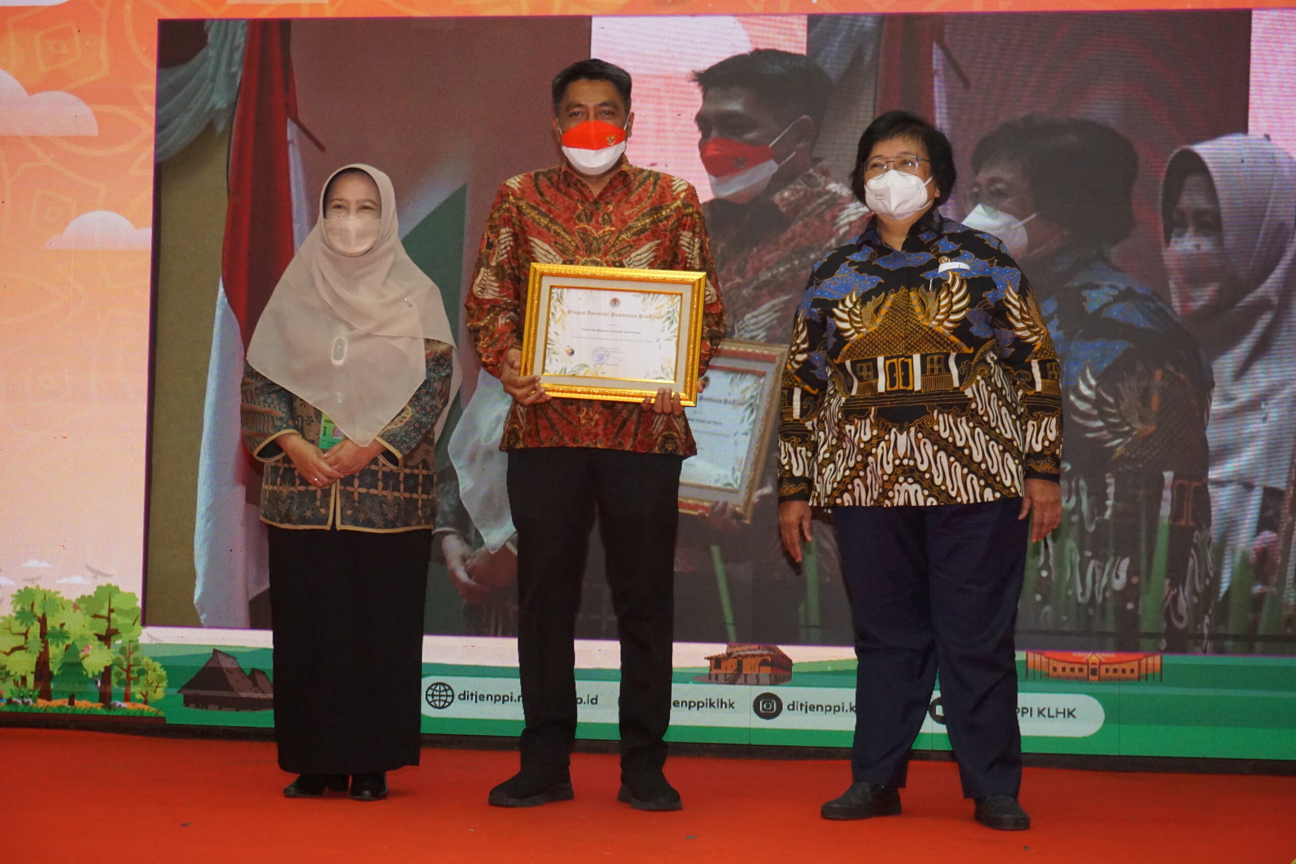 TERIMA PENGHARGAAN : Zaenal Arifin menerima penghargaan Proklim dari Menteri Lingkungan Hidup dan Kehutanan RI, Siti Nurbaya Bakar didampingi Dirjen Pengendalian Perubahan Iklim (KLHK), Lhaksmi Dhewanti (Dok Prokompim Kab Magelang)