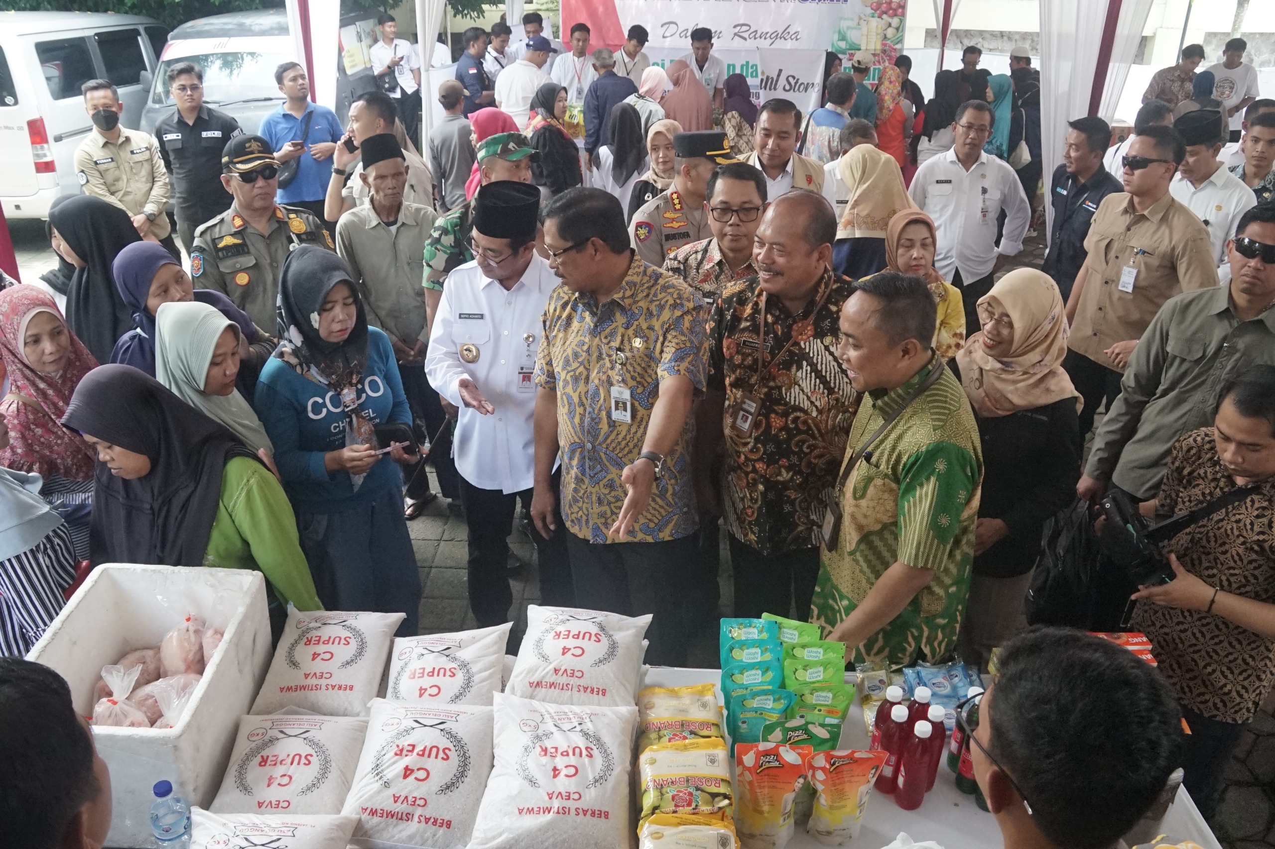 PANTAU LANGSUNG : PJ Gubernur Jawa Tengah Nana Sudjana didampingi Pj Bupati Magelang Sepyo Achanto saat memantau langsung kegiatan pangan murah di halaman Kantor Kecamatan Mungkid (Dok Prokompim Kab Magelang)