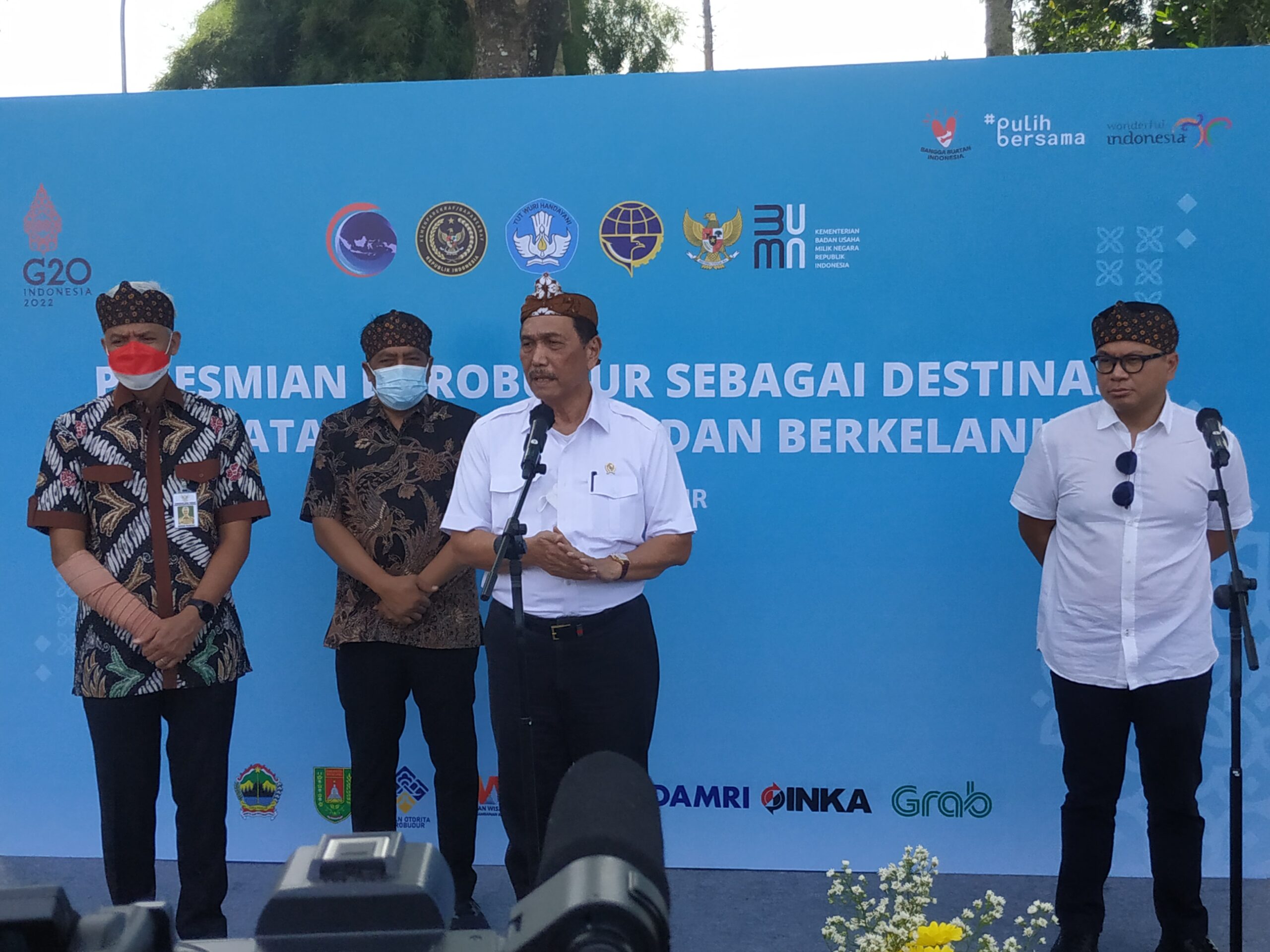PENATAAN BOROBUDUR : Menko Bidang Kemaritiman dan Investasi, Luhut Binsar Pandjaitan konferensi pers usai meresmikan Stasiuan Pengisian Kendaraan Listrik Umum (SPKLU) di kawasan Borobudur (Hadianto/wartamagelang.com)