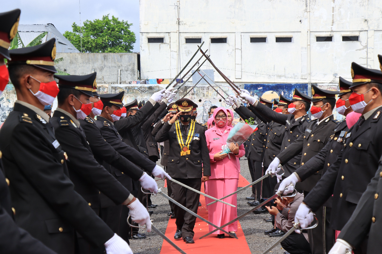 TRADISI WISUDA : Para personel Polres Magelang Kota melewati pedang pora sebagai tradisi pelepasan (Dok Humas Polres Magelang Kota)
